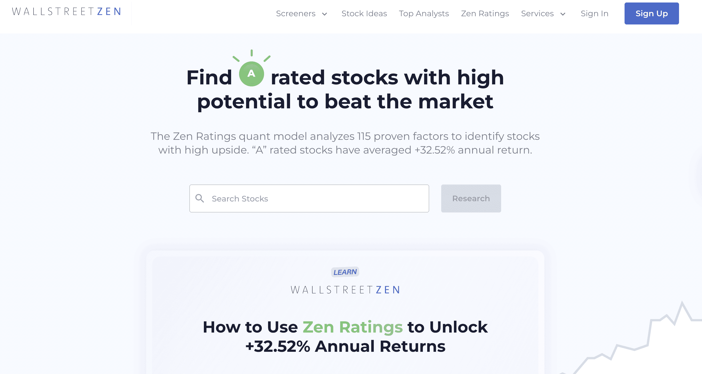 Pros: Zen Ratings use AI to analyze 115 proven factors for A-F grades—A-rated stocks averaged +32.52% annualized returns since 2003. Simple screener, top analyst filters, and one-sentence price catalysts.